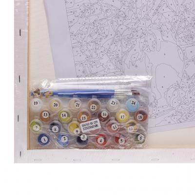- Памучно платно (канава) с подрамка, размери 40 х 50 см. Платното е с отпечатани фрагменти с номера, като всеки номер съответства на номер на боя в комплекта.