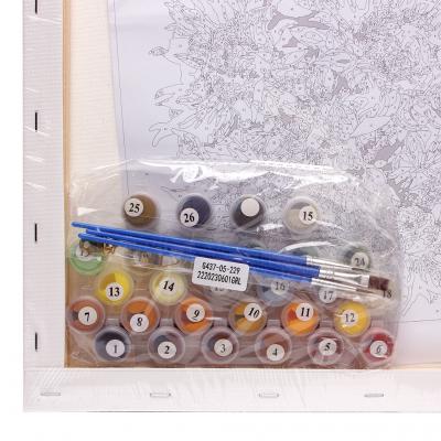 - Памучно платно (канава) с подрамка, размери 40 х 50 см. Платното е с отпечатани фрагменти с номера, като всеки номер съответства на номер на боя в комплекта.
