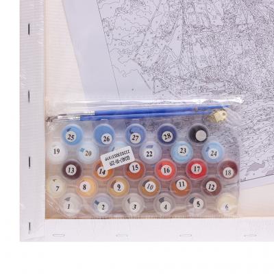 - Памучно платно (канава) с подрамка, размери 40 х 50 см. Платното е с отпечатани фрагменти с номера, като всеки номер съответства на номер на боя в комплекта.