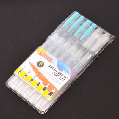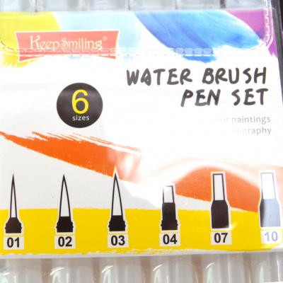 Комплект 6 броя кръгли четки за рисуване с водни бои. Четките са с резервоарче за вода, за оцветяване на хартия с мастило или за акварел. За да напълните резервоарчето, завъртете и махнете горната част и потопете писалката в чаша с вода. Дължина: 19 см. Размери: 1, 2, 3, 4, 7 и 10.