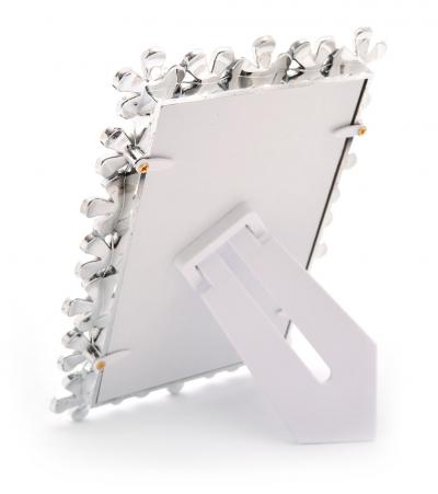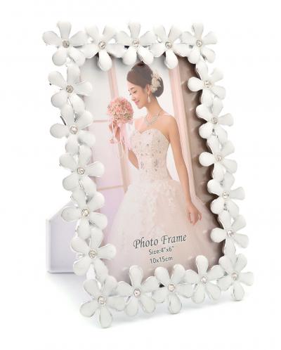 Луксозна бяла рамка за снимка, изработена от PVC материал. Рамката е декорирана с бели цветчета и блестящи камъчета, подходяща за сватбени снимки. Подходяща е и за вертикални и за хоризонтални снимки, с фронт стъкло и с краче на гърба. Рамката е за снимка с размери: 10х15 см.
