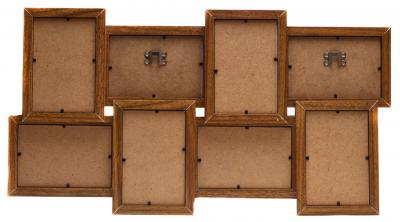 Мулти рамка за 8 снимки, изработена от MDF материал. Рамката е с кукичка за закачване на стена. Рамката е подходяща за 4 хоризонтални и 4 вертикални снимки с размери: 10х15 см. Размери на рамката: 62х32 см.