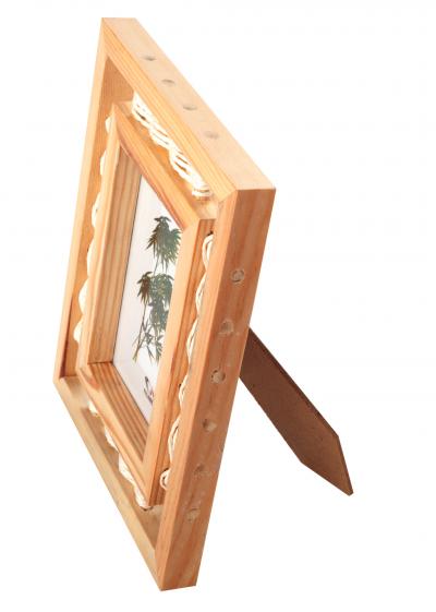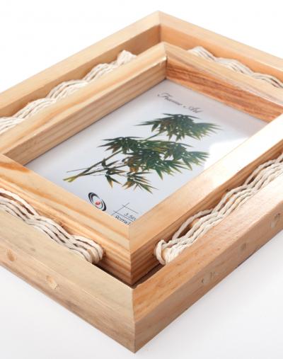 Рамка за снимка от дърво декорирана с въженце. Има опора за поставяне. Няма кукички за окачване.