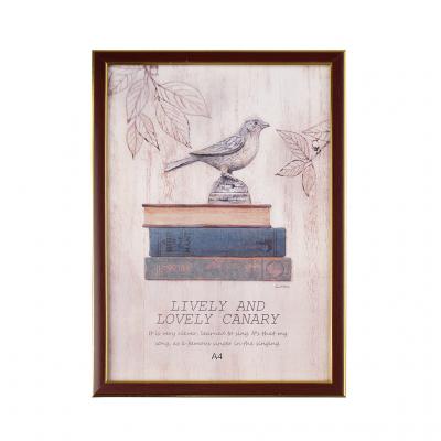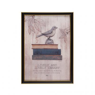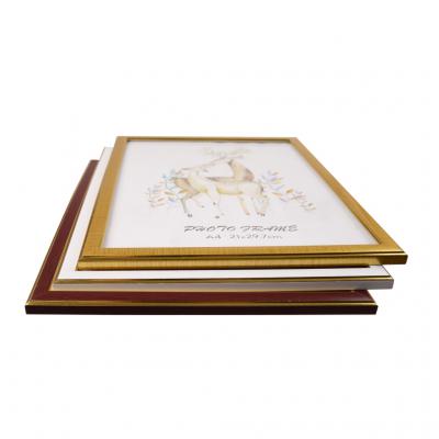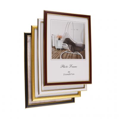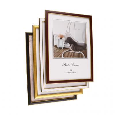 Рамка за снимка със златисти кантове. С фронт стъкло и кукичка за вертикално и хоризонтално окачване. Изработена от PVC материал. Рамката е подходяща за снимка А4 формат с размери: 21х29.7 см.