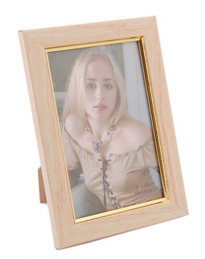Рамка за снимки със златист вътрешен кант - имитация на дърво. Рамката има фронт стъкло и гръб с поставка за поставяне хоризонтално и вертикално. Подходяща за снимки с размер: 10х15см.