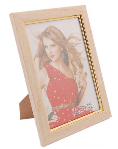 Рамка за снимки със златист вътрешен кант - имитация на дърво. Рамката има фронт стъкло и гръб с поставка за поставяне хоризонтално и вертикално. Подходяща за снимки с размер: 13х18см.