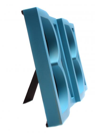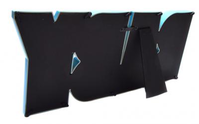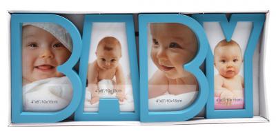 Синя мулти рамка за 4 снимки - надпис BABY. Рамката е изработена от PVC материал, с фронт стълко, кукичка за закачване на стена и краче на гърба. Рамката е подходяща за 4 вертикални снимки с размери: 10х15 см. Размери на рамката: 41.5х18.5 см.