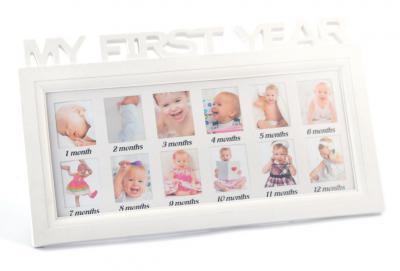 Бяла мултирамка с 12 малки снимки за всеки месец от първата годинка на Вашето дете. Изработена от PVC материал, фронт стъкло и гръб с поставка за хоризонтално поставяне. С възможност за окачване. Подходяща като подарък за бебе.