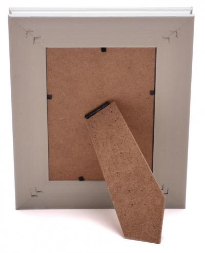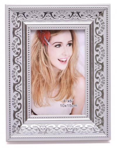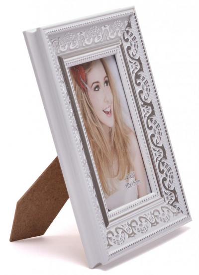 Бяла рамка за снимки със сребристи орнаменти. Рамката има гръб с поставка за поставяне хоризонтално и вертикално. Подходяща за снимки с размери: 10х15см. Различни цветове.