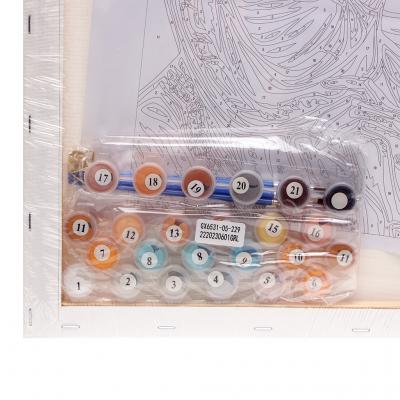 - Памучно платно (канава) с подрамка, размери 40 х 50 см. Платното е с отпечатани фрагменти с номера, като всеки номер съответства на номер на боя в комплекта.