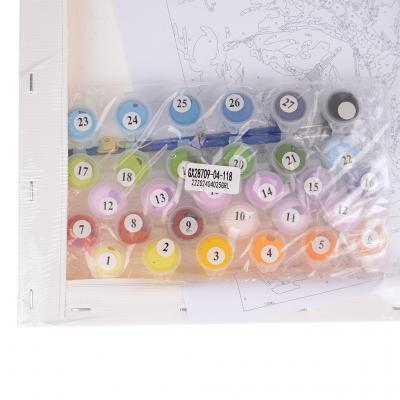 - Памучно платно (канава) с подрамка, размери 40 х 50 см. Платното е с отпечатани фрагменти с номера, като всеки номер съответства на номер на боя в комплекта.