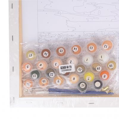 - Памучно платно (канава) с подрамка, размери 40 х 50 см. Платното е с отпечатани фрагменти с номера, като всеки номер съответства на номер на боя в комплекта.