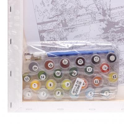- Памучно платно (канава) с подрамка, размери 40 х 50 см. Платното е с отпечатани фрагменти с номера, като всеки номер съответства на номер на боя в комплекта.