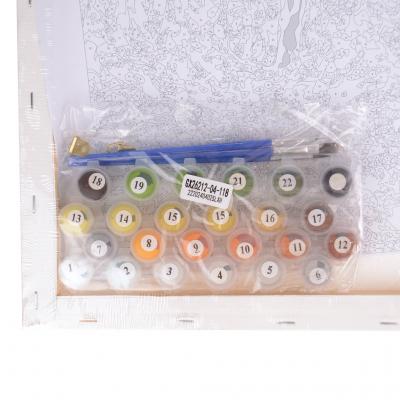 - Памучно платно (канава) с подрамка, размери 40 х 50 см. Платното е с отпечатани фрагменти с номера, като всеки номер съответства на номер на боя в комплекта.