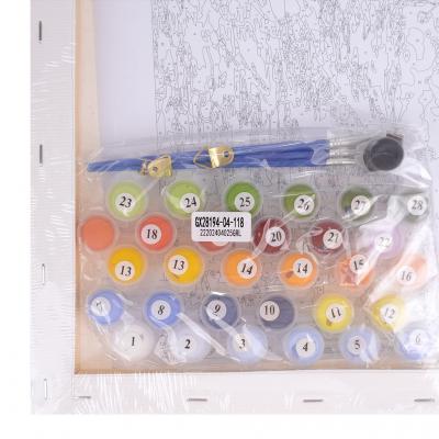 - Памучно платно (канава) с подрамка, размери 40 х 50 см. Платното е с отпечатани фрагменти с номера, като всеки номер съответства на номер на боя в комплекта.