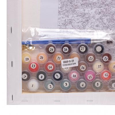 - Памучно платно (канава) с подрамка, размери 40 х 50 см. Платното е с отпечатани фрагменти с номера, като всеки номер съответства на номер на боя в комплекта.