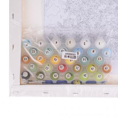 - Памучно платно (канава) с подрамка, размери 40 х 50 см. Платното е с отпечатани фрагменти с номера, като всеки номер съответства на номер на боя в комплекта.