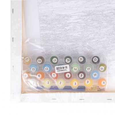 - Памучно платно (канава) с подрамка, размери 40 х 50 см. Платното е с отпечатани фрагменти с номера, като всеки номер съответства на номер на боя в комплекта.