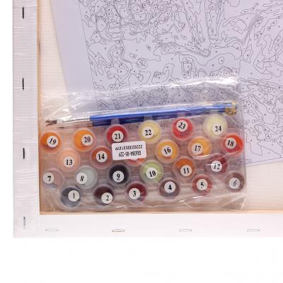 - Памучно платно (канава) с подрамка, размери 40 х 50 см. Платното е с отпечатани фрагменти с номера, като всеки номер съответства на номер на боя в комплекта.
