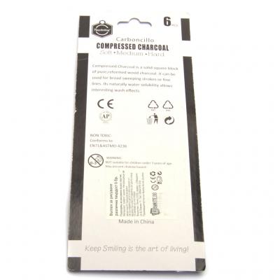 Комплект от шест броя пресовани въглени за рисуване. Въглените са с различна твърдост: 2 броя soft, 2 броя medium и 2 броя hard. Подходящи за фини линии и широки щрихи. Размери: 6.5х1х1 см.