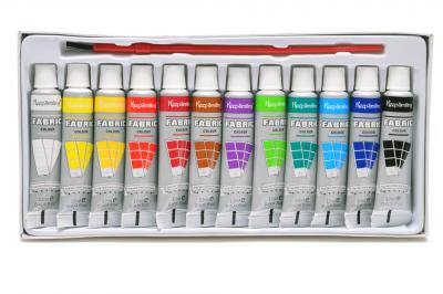 Комплект 12 бои за рисуване върху текстил и четка. Всички бои са в PVC туба с вместимост 12 ml.