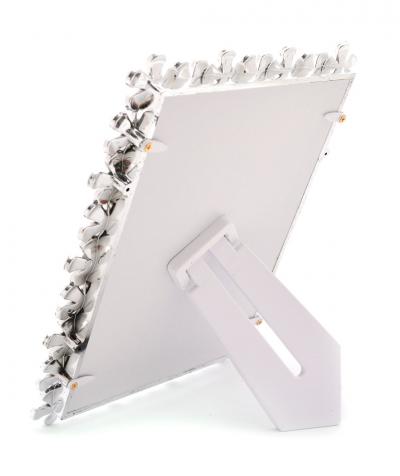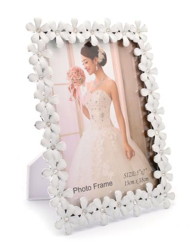 Луксозна бяла рамка за снимка, изработена от PVC материал. Рамката е декорирана с бели цветчета и блестящи камъчета, подходяща за сватбени снимки. Подходяща е и за вертикални и за хоризонтални снимки, с фронт стъкло и с краче на гърба. Рамката е за снимка с размери: 13х18 см.