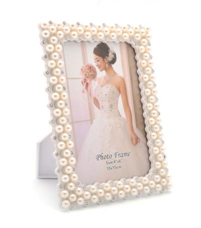 Луксозна бяла рамка за снимка, изработена от PVC материал. Рамката е декорирана с бели перли и блестящи камъчета, подходяща за сватбени снимки. Подходяща е и за вертикални и за хоризонтални снимки, с фронт стъкло и с краче на гърба. Рамката е за снимка с размери: 10х15 см.