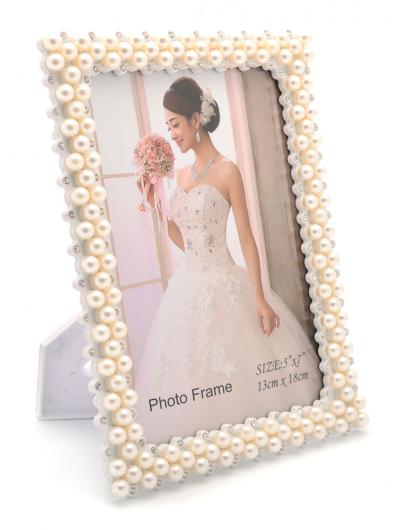 Луксозна бяла рамка за снимка, изработена от PVC материал. Рамката е декорирана с бели перли и блестящи камъчета, подходяща за сватбени снимки. Подходяща е и за вертикални и за хоризонтални снимки, с фронт стъкло и с краче на гърба. Рамката е за снимка с размери: 13х18 см.