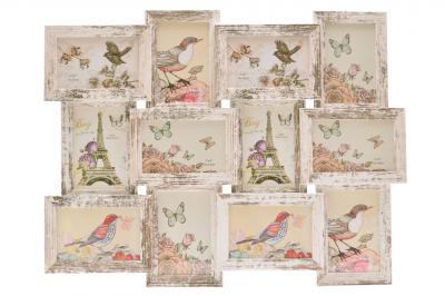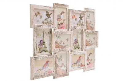 Мулти рамка за 12 снимки във винтидж стил - бяло, състарено дърво. Изработена от MDF материал, с кукички за закачване на стена. Рамката е подходяща за 6 хоризонтални и 6 вертикални снимки с размери: 10х15 см.