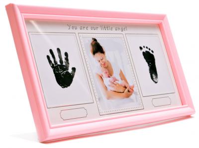 Розова мулти рамка за снимка и място за отпечатък от краче и ръчичка на бебе. Рамката е с надпис You are our little angel и табелки за надписване на дата. Комплектът включва мастилница за вземане на отпечатъците. Мастилото е безвредно и се почиства лесно. Рамката е с краче на гърба и фронт стъкло, изработена от PVC материал. Рамката е подходяща за снимка с размери: 10.5х12.5 см. Общ размер на рамката: 40х20.5 см.