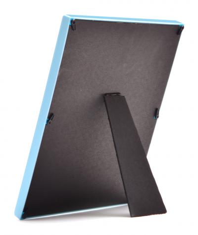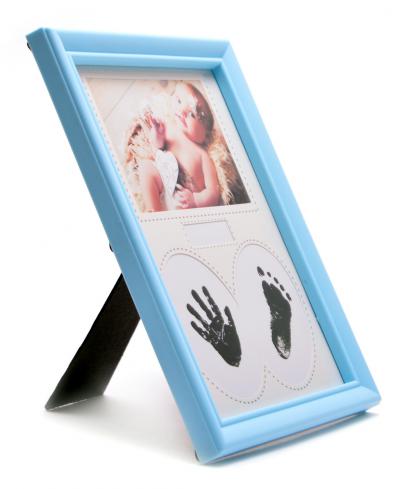 Синя мулти рамка за снимка и място за отпечатък от краче и ръчичка на бебе и табелка за надписване на дата. Комплектът включва мастилница за вземане на отпечатъците. Мастилото е безвредно и се почиства лесно. Рамката е с краче на гърба и фронт стъкло, изработена от PVC материал. Размери: 22х26 см.