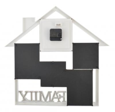 Стилна бяла рамка за 4 бр. снимки във формата на къщичка с часовник. Рамката е с надпис Family. Предлага се без батерии. Подходяща за съхранение на семейни снимки по Ваш избор или като оригинален подарък.