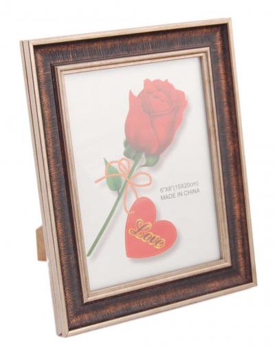 Стилна рамка за снимки със златист вътрешен и външен кант. Рамката има фронт стъкло и гръб с поставка за поставяне хоризонтално и вертикално. Подходяща за снимки с размер: 15х20см. Различни цветове.