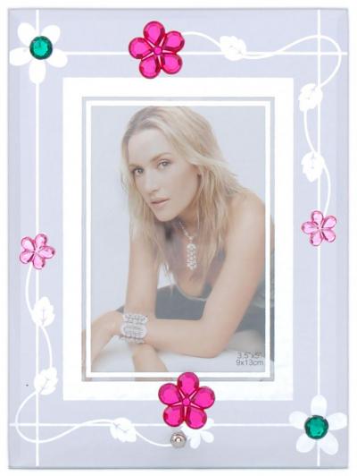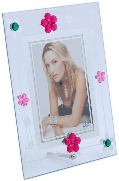 Стъклена рамка за снимка, красиво украсена с флорални мотиви и цветни камъни във формата на маргаритки. Рамката е подходяща за снимка с размер - 9х13см.