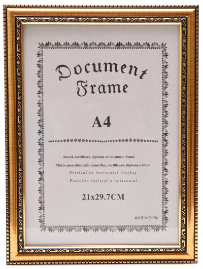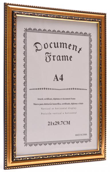 Стилна фоторамка, украсена с декоративни златисти орнаменти. Изработена от фронт стъкло, PVC материал и кукичка за закачане. Рамката е подходяща за снимка с размер: 21х29.7см, както за грамоти, дипломи и други документи с размери А4.