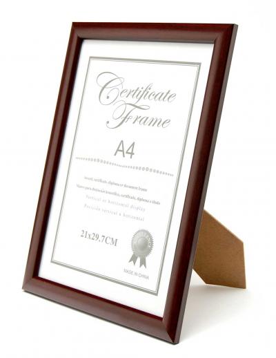 Стилна тъмно кафява рамка подходяща за грамоти, дипломи и други документи с размери А4. Има кукичка за закачане на стена.