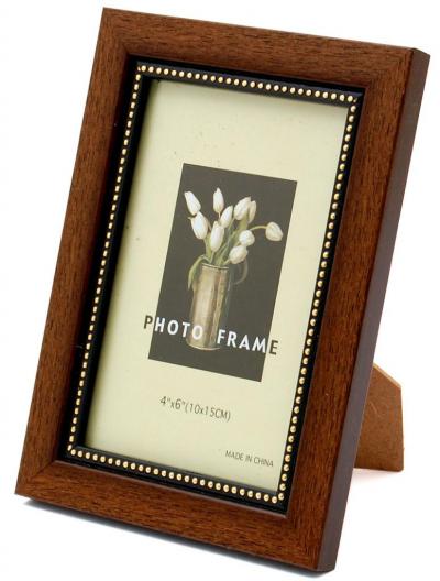 Красива фоторамка за снимки. Изработена от фронт стъкло, PVC материал, създаващ впечатление за дърво и гръб с поставка. Рамката е декорирана със златисти орнаменти. Подходяща за снимка с размер - 10х15см.