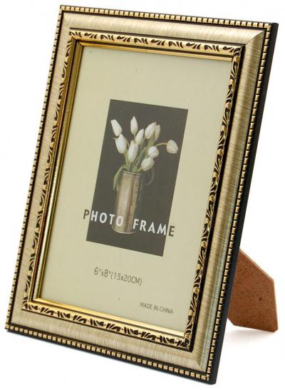Красива фоторамка за снимки, украсена с декоративни златисти орнаменти. Изработена от фронт стъкло, PVC материал и гръб с поставка. Рамката е подходяща за снимка с размер - 15х20см.