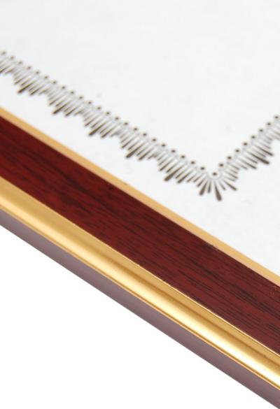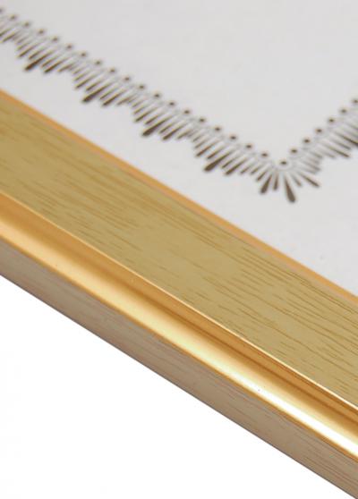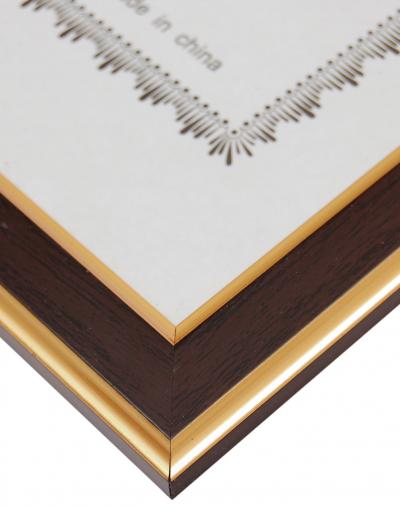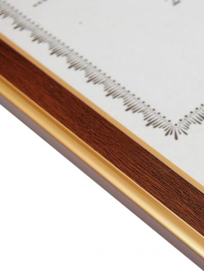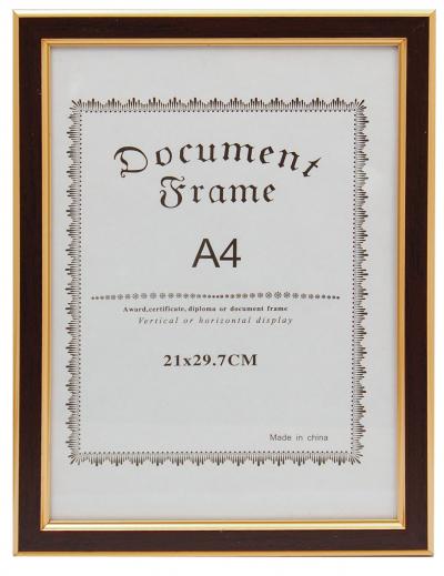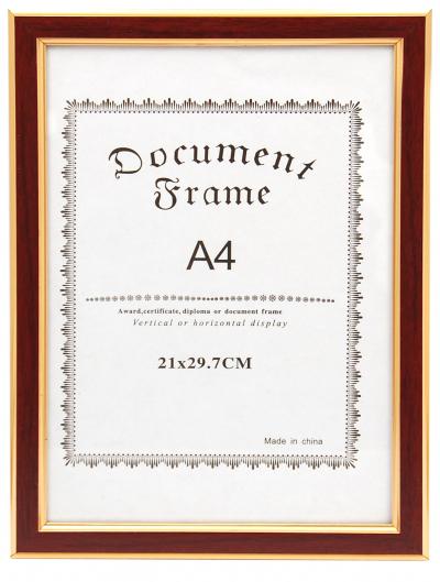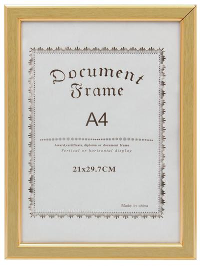 Рамка с златен кант подходяща за дипломни работи, грамоти. Вътрешен размер А4. Има кукичка за закачане на стена вертикално.