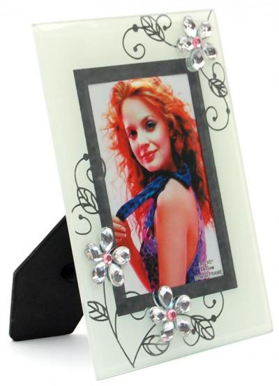 Стъклена рамка за снимка, красиво украсена с флорални мотиви и камъни. Рамката е подходяща за снимка с размер - 9х13см