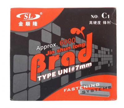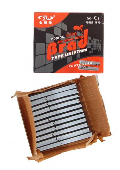 V-образни скоби за сглобяване на MDF или дървени профили за рамки. Скобите са изработени от по тънка ламарина за по-лесна работа с MDF профили. Височина 7 мм, стандарт UNI (универсални). Приблизителен брой в кутия 5900 бр.