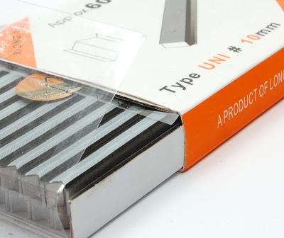 V-образни скоби за сглобяване на PS или дървени профили за рамки. Височина 10 мм, стандарт UNI (универсални). Приблизителен брой в кутия 5900 бр.